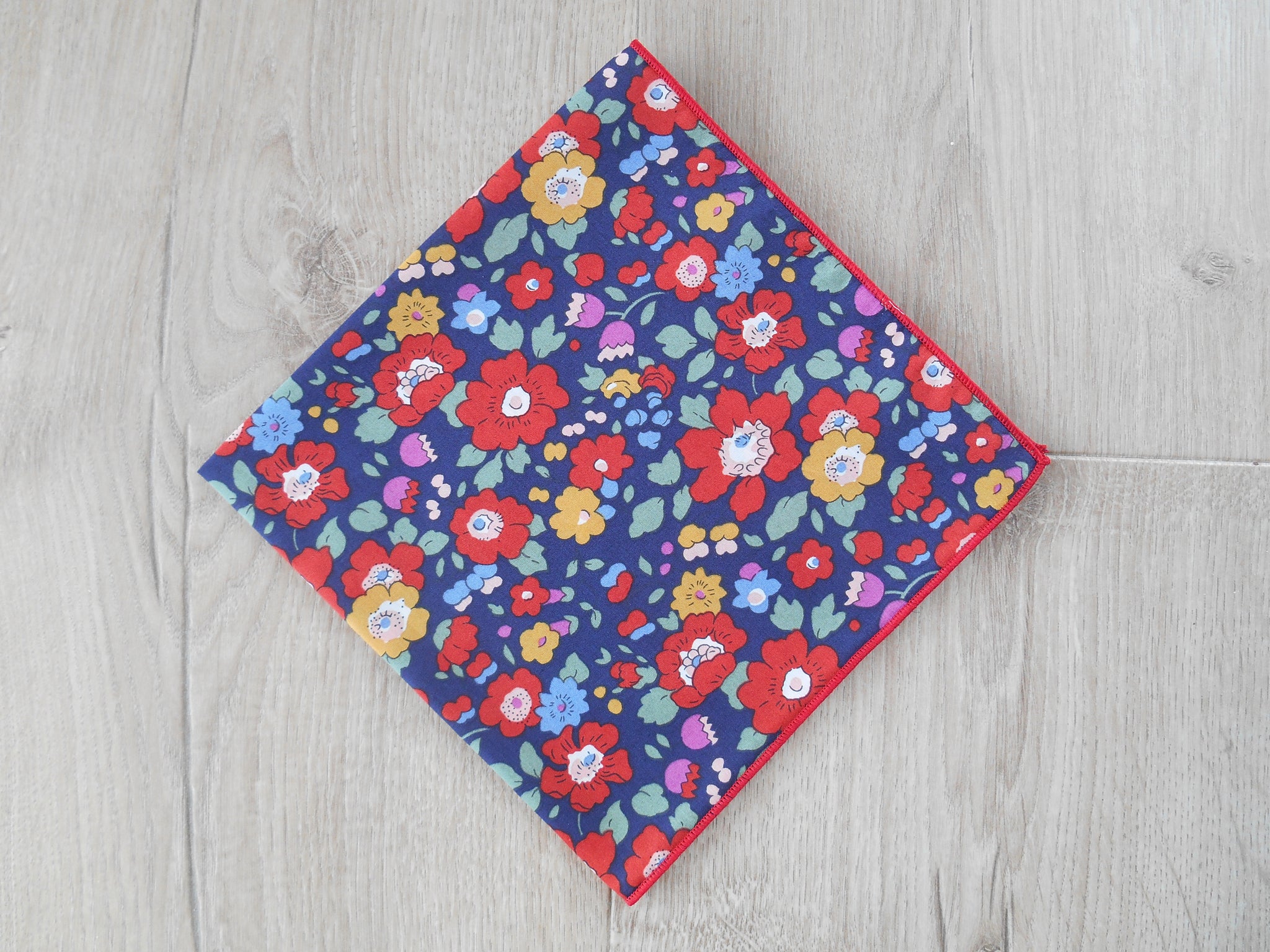 These exquisite handkerchiefs/pocket squares are a generous size measuring 31cm x 31cm (12"x12") and are made from 100% cotton Liberty of London Tana Lawn fabric. They are beautifully finished with a decorative co-ordinated rolled edge hem.  There are three colourways to choose from in this design and they are sold individually.  Each handkerchief is meticulously handmade and comes packaged in a clear cello bag - making the perfect gift for any occasion, or treat yourself!
